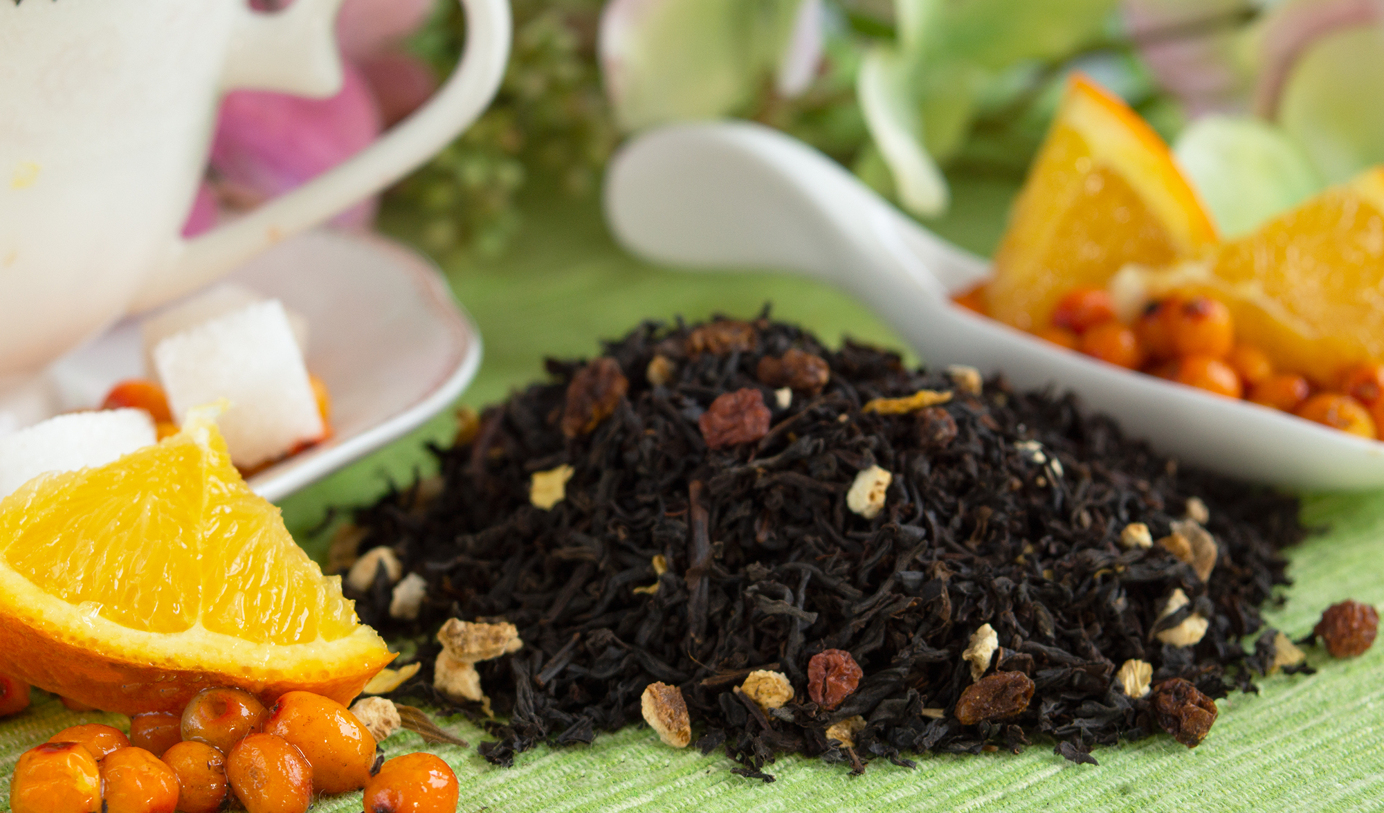 Состав: Чай черный рассыпной листовой крупный, цедра апельсина, ягоды облепихи, лепестки подсолнечника, ароматизировано маслами.