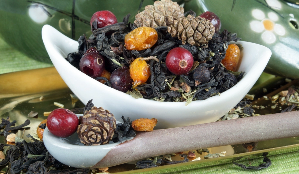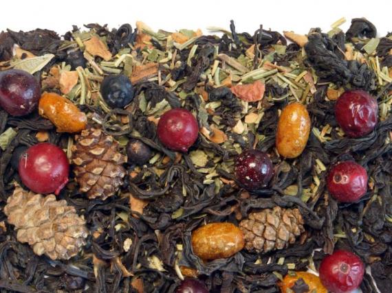 Состав: чай чёрный рассыпной листовой крупный, кусочки яблока, розмарин, листья черной смородины, листья мелиссы, ягоды можжевельника, шишка сушеная, ягоды клюквы, облепиха целая.