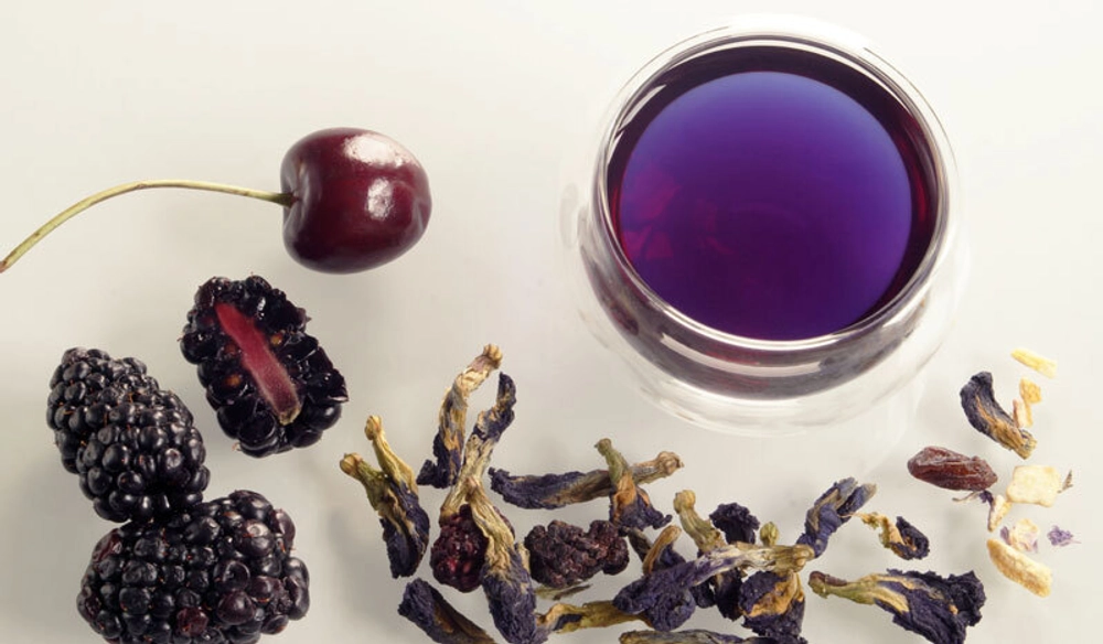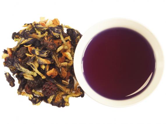 Чай «Индиго» – бленд анчана синего с цедрой лимона, кусочками яблока, ягодами ежевики, изюмом и лепестков мальвы.
